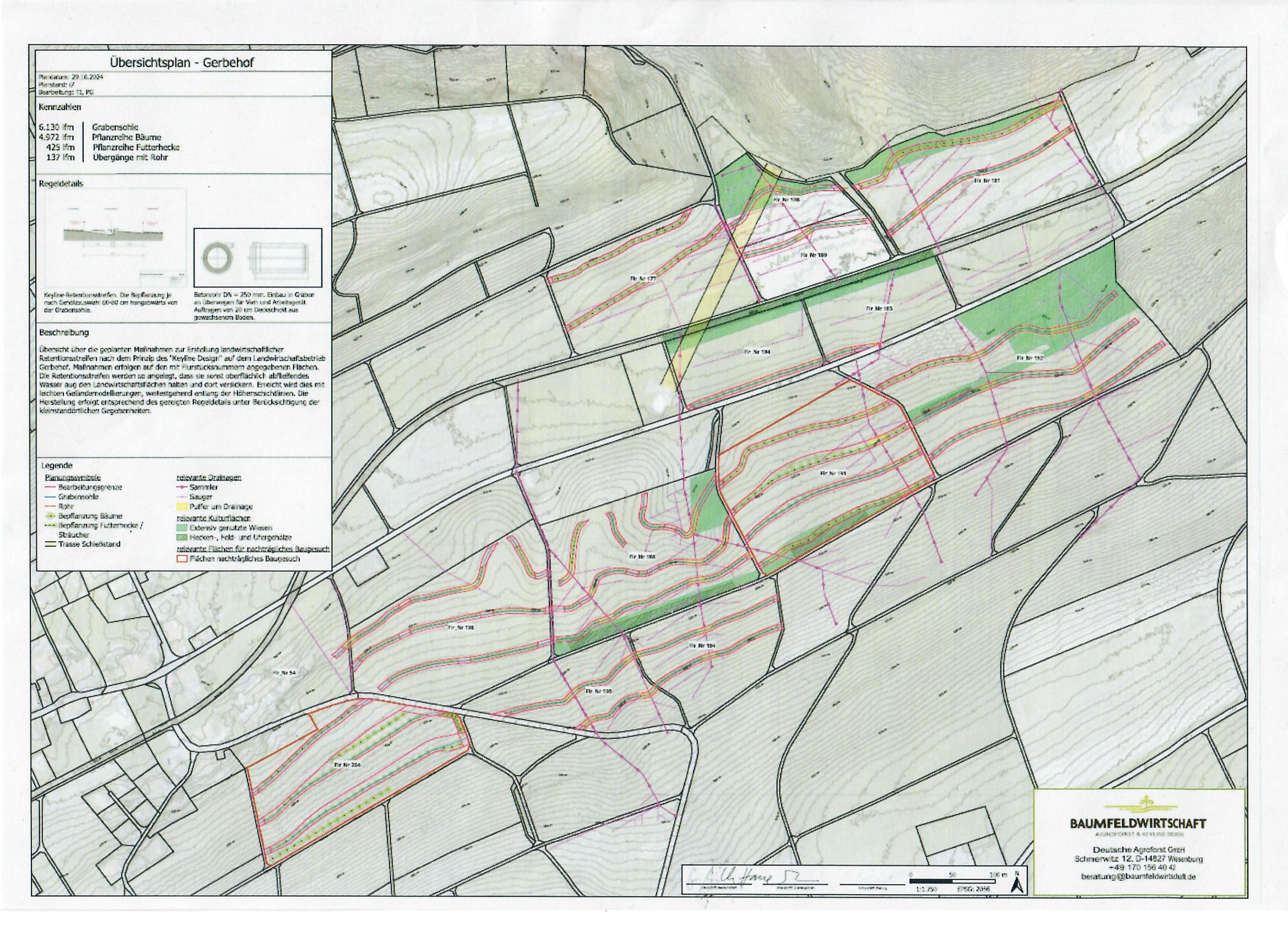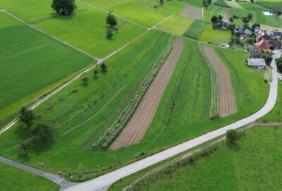Für die gesamte Betriebsfläche in Bibern haben wir ein Agroforst-Keyline-Design planen lassen. Gemeinsam mit Philipp Gerhardt und seinem Team von Baumfeldwirtschaft.de wurden für jede Parzelle Retentionslinien (keylines) entlang der Höhenlinien eingemessen, die ein effektives Wassermanagement ermöglichen.